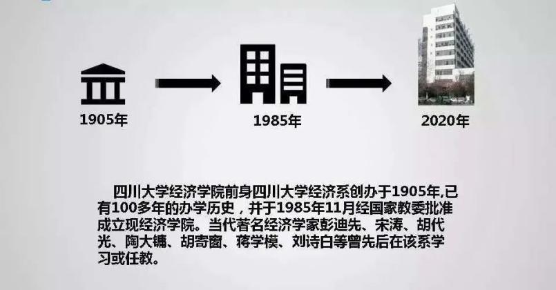 百年探索,悠久传承。川大经济学院前身是创建于1905年的四川大学经济科,距今已经有100多年的历史。著名经济学家彭迪先、张与九、蒋学模、胡寄窗、宋涛、陶大镛、胡代光、周春、刘诗白等先后在此传道授业。