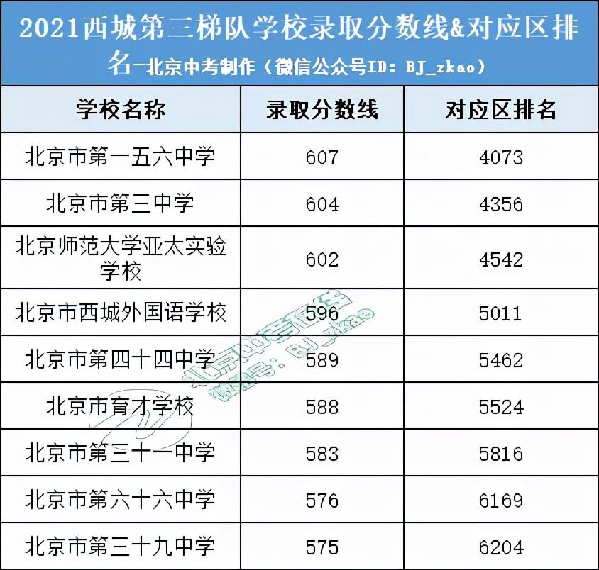 2021年西城区第三梯队包含上述9所学校,录取分数在570分到609分之间的考生有2638人,这部分学校适合成绩在中游的考生参考选择。