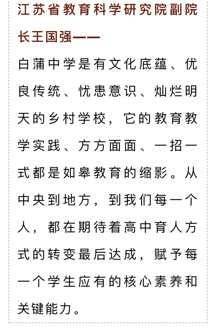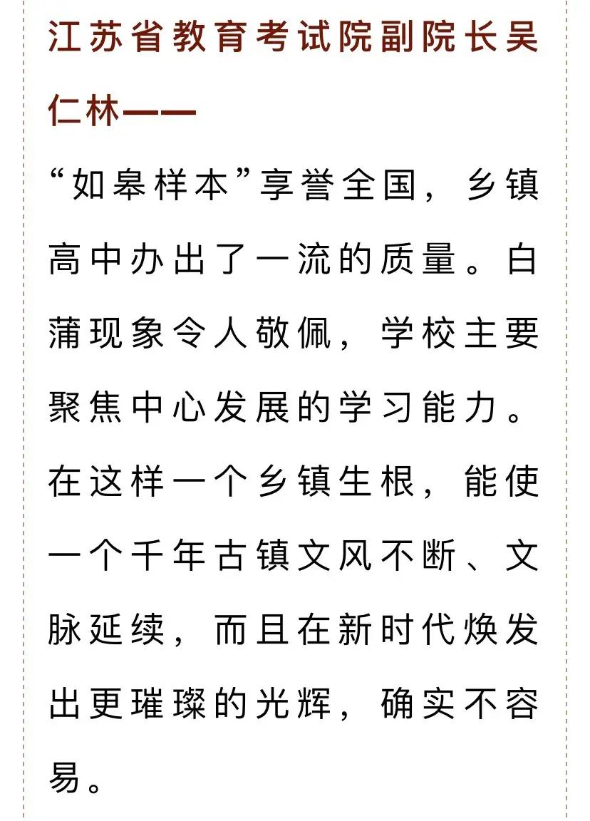 白蒲中学是如皋教育的一份子,是如皋教育精彩纷呈中的一种样子,一种画像,是高中教育面向未来高品质发展、引领性发展的一个典型。
