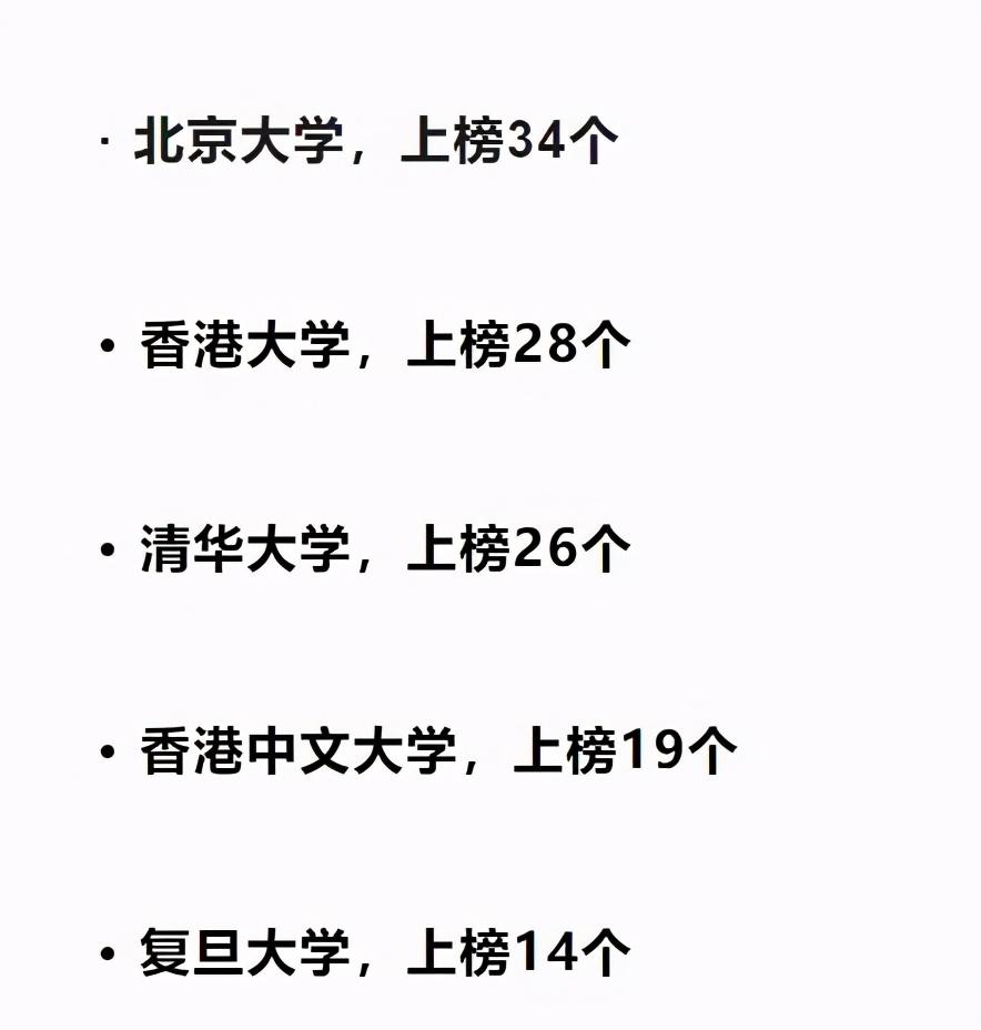 其次排在第三位的是香港大学,共有28个学科上榜,超越了清华大学,第四名是香港中文大学,共有19个学科上榜。