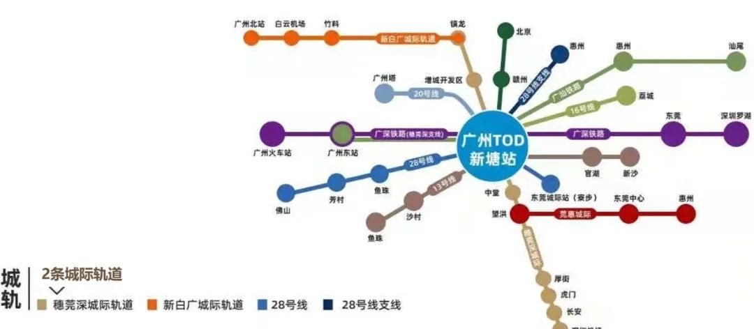 穗莞深城轨(已开通),从新塘可快速通达东莞、深圳等核心城市,未来还将连接至香港。新白广城轨(在建中,预计2022年12月底开通),开通后将1站到新塘TOD,2站到黄埔,3站到天河,往北直达白云机场。
