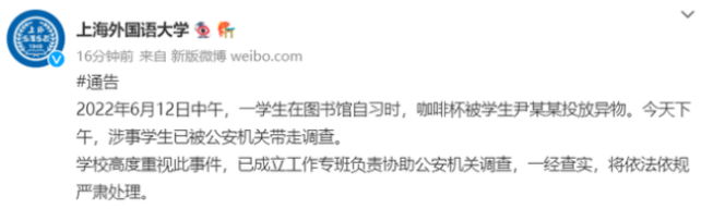 起因是上外的一位女大学生在图书馆学习,为了让自己能够更精神一些,特意冲泡了一杯咖啡,而等到吃完饭回来后,便感觉被子像是被人动过一般,就连味道都变了,而在查看监控后却发现,一名她认识的男生在她的杯子里投了“异物”。