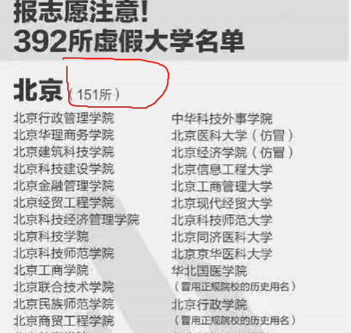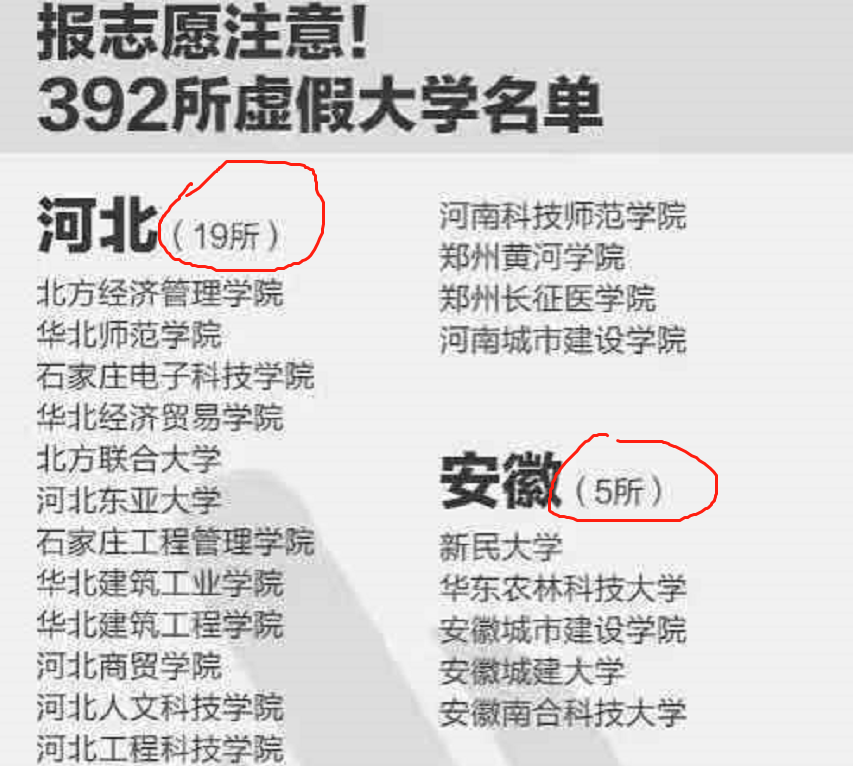 我国共有392所野鸡大学,其中北京市有151所,天津16所,上海30所,河北19所,河南7所,安徽5所,广东12所,重庆3所,福建5所,湖北15所,湖南7所,浙江9所,广西3所,贵州2所,吉林4所,黑龙江5所,辽宁7所,江西7所,山西9所,甘肃、青海、宁夏各1所,四川15所,山西16所,具体名单可以进行网上查询。