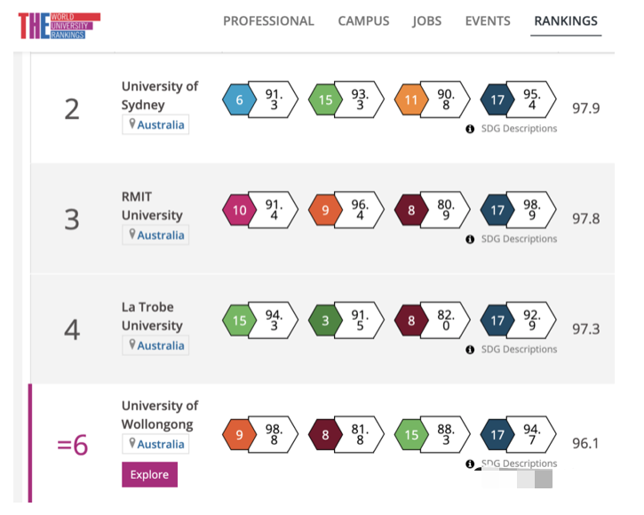 澳大利亚的大学在TOP10中占据4席,分别为第二名的悉尼大学、第三名的皇家墨尔本理工大学、第四名的拉筹伯大学以及第六名的伍伦贡大学。