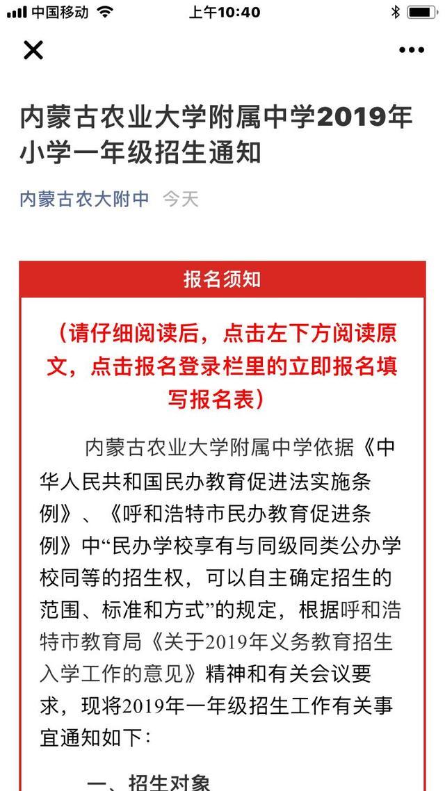 今天,2019年5月10日,内蒙古农业大学附属中学发布2019年小学一年级招生通知,凡是在呼和浩特市赛罕区居住和就业的都可以报名啦。