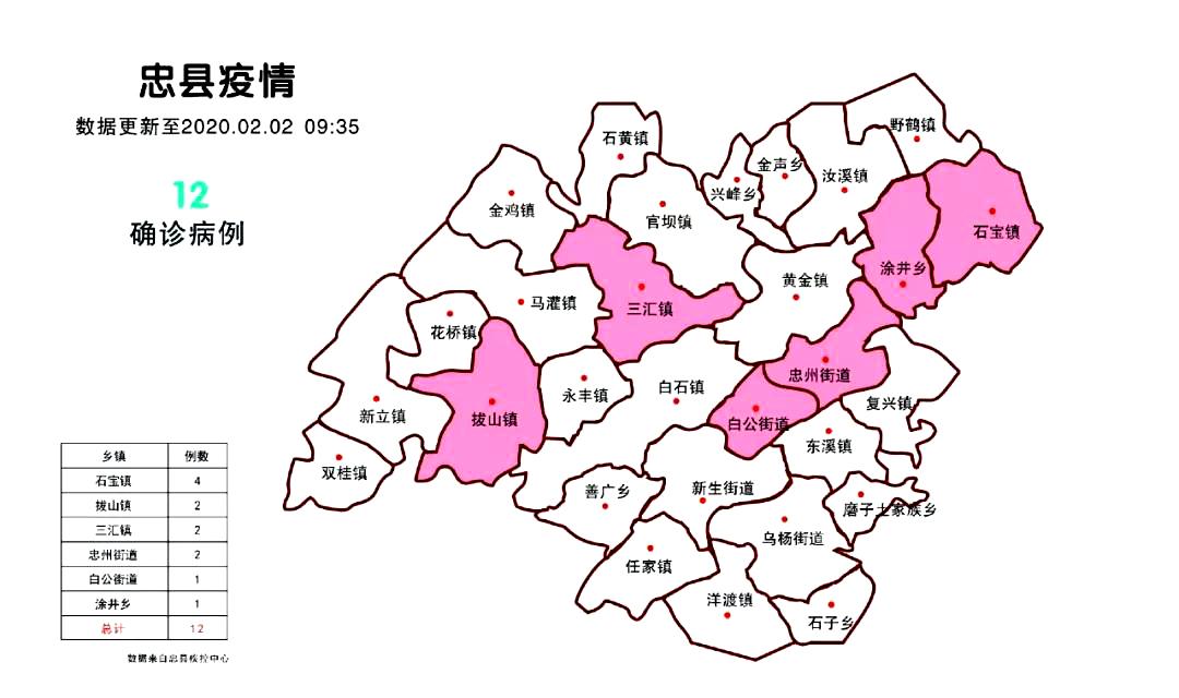 数据更新至2月2日9:35,忠县共有新型冠状病毒肺炎确诊病例12例,其中:石宝镇4例,拔山镇2例,三汇镇2例,忠州街道2例,白公街道1例,涂井乡1例。