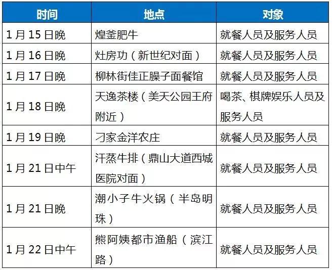 经过全面的流行病学调查,以下时间段在相关区域人员可能与我区新型冠状病毒感染的肺炎患者有接触: