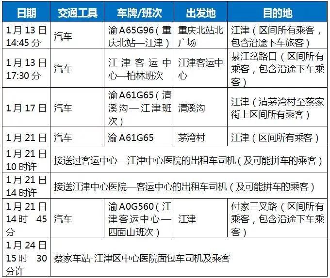 经过全面的流行病学调查,以下车次和人员与江津区新冠病毒感染的肺炎病例有接触。