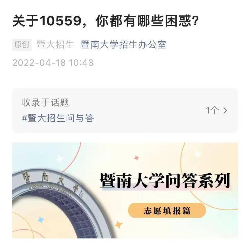 4月18日,暨南大学招生办公室,发布招生问答系列(志愿填报篇),对报考暨南大学的一系列问题进行了答疑。