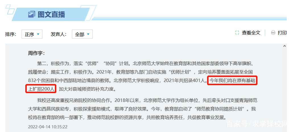 4月,教育部召开新闻发布会介绍《新时代基础教育强师计划》,北京师范大学副校长周作宇在发布会上表示,2021年北师大优师计划招录401人。今年, 学校将在原有基础上扩招200人,加大对县域师资的补充力度。