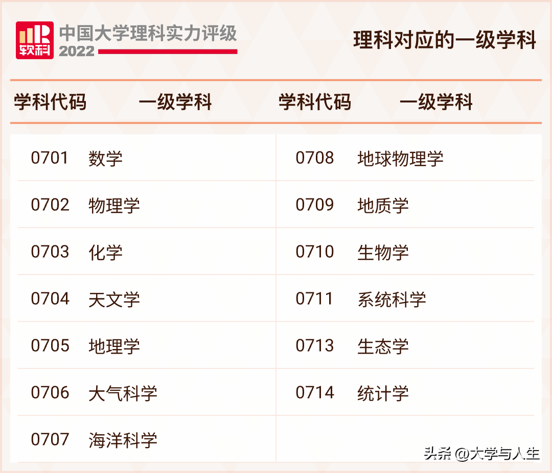 中国大学理科实力评级的对象为所有被纳入2022软科中国大学排名的高校。理科的范围包括理学门类的13个学科,具体如下: