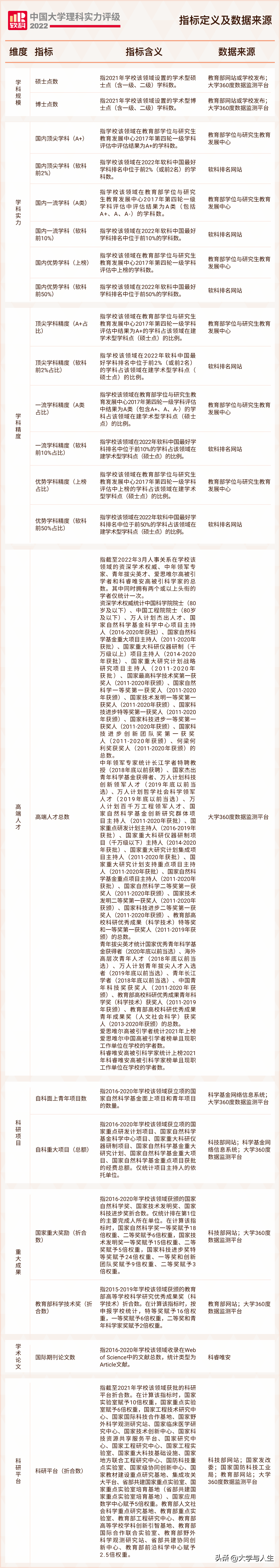 中国大学理科实力评级包含学科规模、学科实力、学科精度、高端人才、科研项目、重大成果、学术论文和科研平台8个维度。