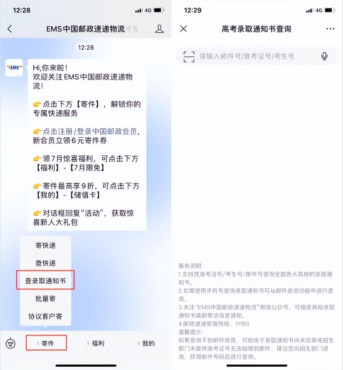 关注“EMS中国邮政速递物流”微信公众号,点击“个人寄件”—“录取通知书”,输入14位考生号(广东考生为10位)进行查询。