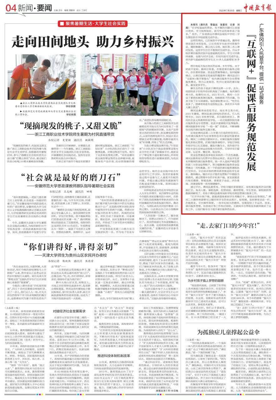 7月20日,中国教育界权威报刊《中国教育报》以《广东省佛冈引入托管平台,提供一站式服务 —— 互联网+促课后服务规范发展》为题,对今托管平台开创的“互联网+数字智能化”全新课后服务管理模式成功赋能广东省佛冈县课后服务高质高效落地的优秀案例进行了深度报道。此报道引起了广泛的关注,人民网等多家主流媒体进行了转载报道。