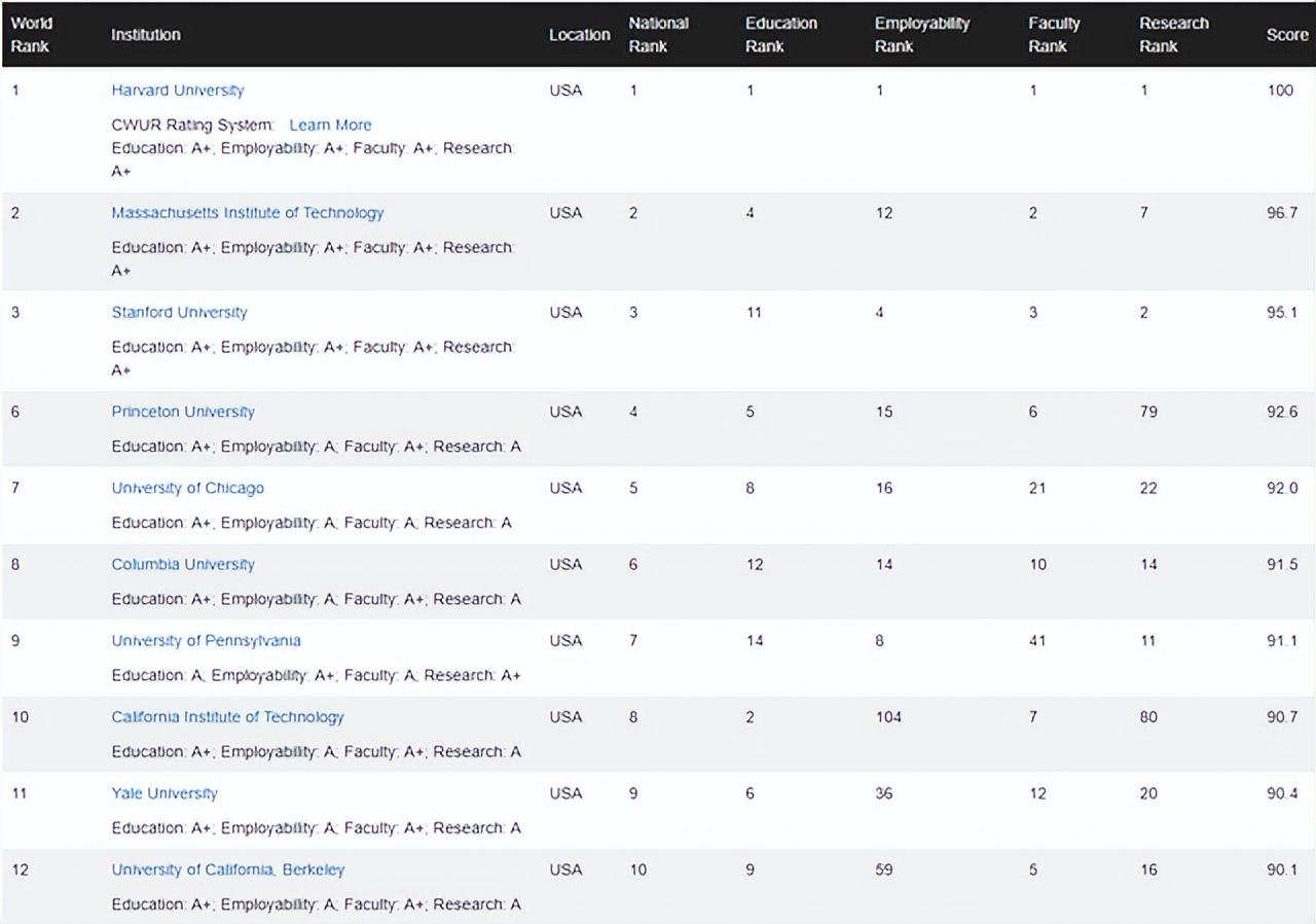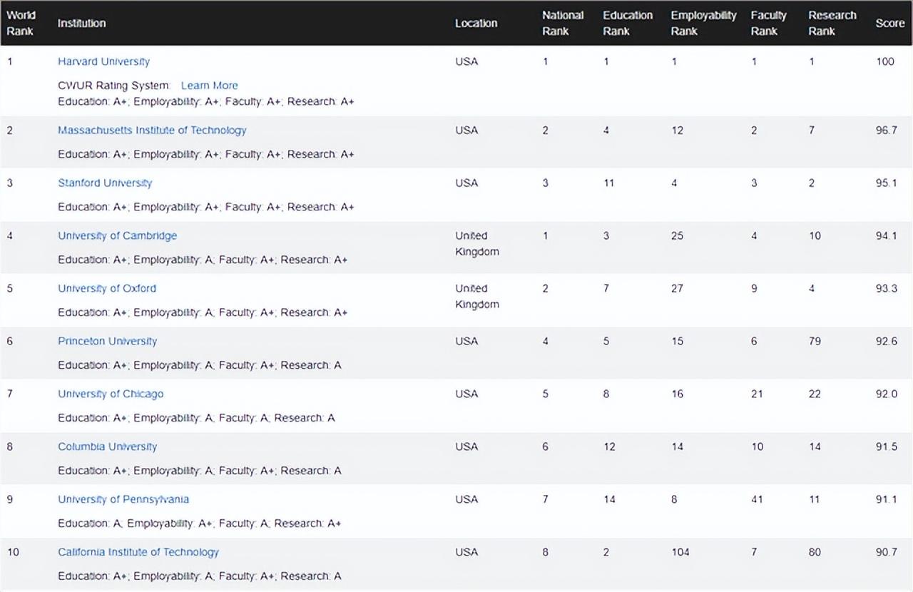 先来看看,CWUR 2022/23年排名世界前10的大学: