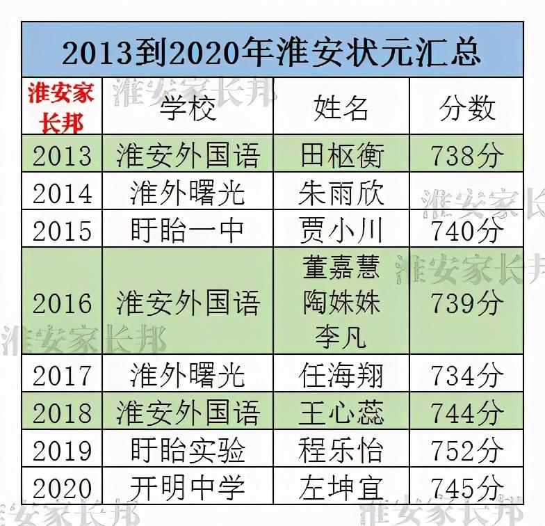 分学校看淮外3次状元一共5人,淮外曙光2次状元,盱眙一中一次,盱眙实验一次,开明中学一次;