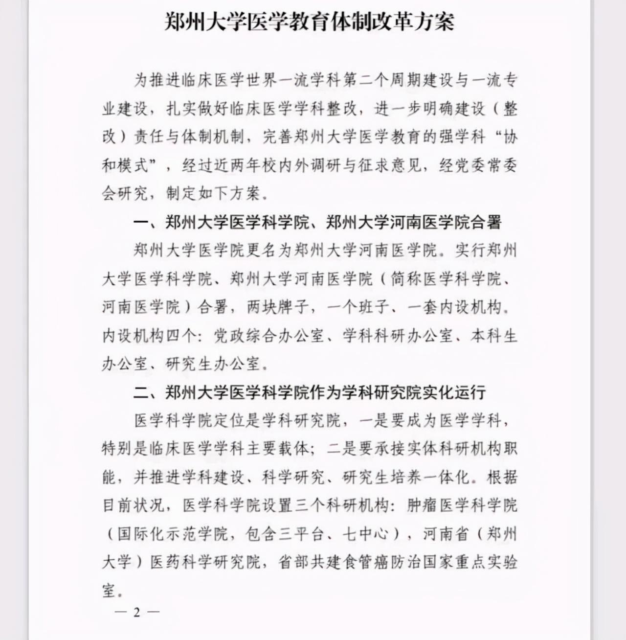 近日,郑州大学医学教育体制改革方案出炉,核心内容就是郑州大学医学院与郑州大学河南医学院合署,郑州大学医学院更名为郑州大学河南医学院。至于这样做的目的是什么,小编就不得而知了,不过民间总体来说,有两个答案,第一,就是防止新乡医学院更名为河南医科大学造成尴尬,换句话说就是“河南医科大学”的名字已经占有了。第二,郑州大学医学院未来恢复“河南医科大学”的校名,而小编认为这个概率太低了,除非该院从郑州大学里面独立出来,不过这样做的好处是河南多了一所“医科大学”了,那么郑州大学的综合实力肯定会削弱,所以可能性不大。