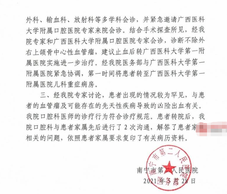 在这封书面答复的最后,医院还推测,琪琪之所以会出现这么严重的情况,是因为患有血管瘤,或者可能与她自身存在的某些先天性出血性疾病有关系。