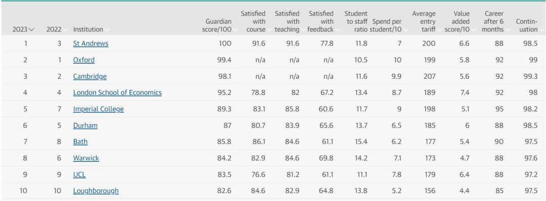 Satisfied with course 课程满意度Satisfied with teaching 授课满意度Satisfied with feedback 教学反馈满意度Student to staff ratio 学生/教员比例Spend per student 学生人均花销Average entry tariff 平均录取成绩(本科)Value added score 增值评分Career after 6 months 毕业后半年内就业情况Continuation 升学率接下来道道就带大家一起看看这个排名的情况!