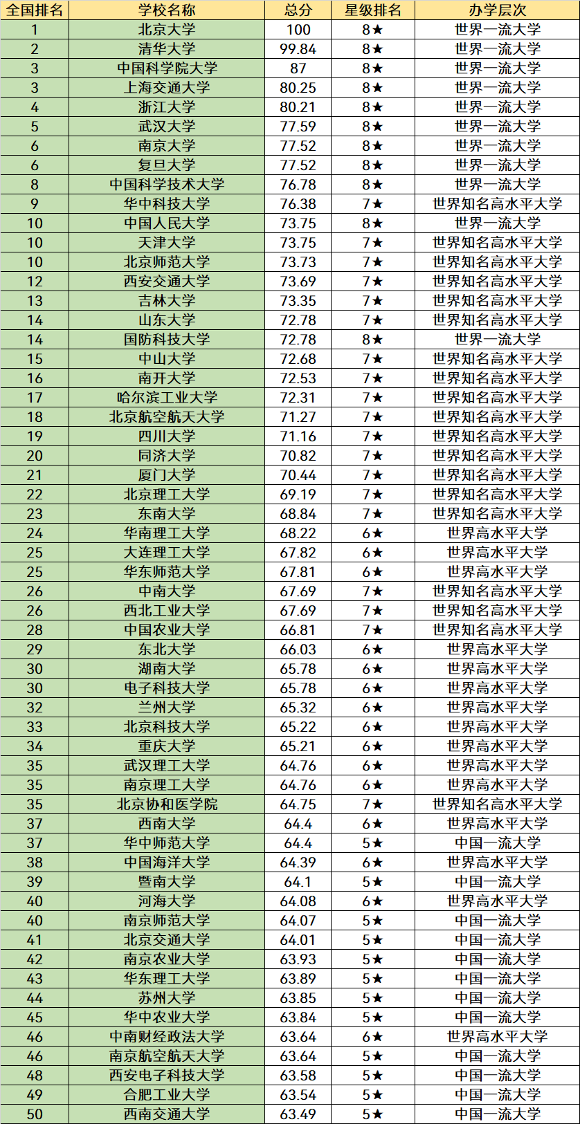考生可以参考这份大学排名名单,大概了解我国大学中排名靠前的都是哪些大学,对于选大学有一定的帮助。