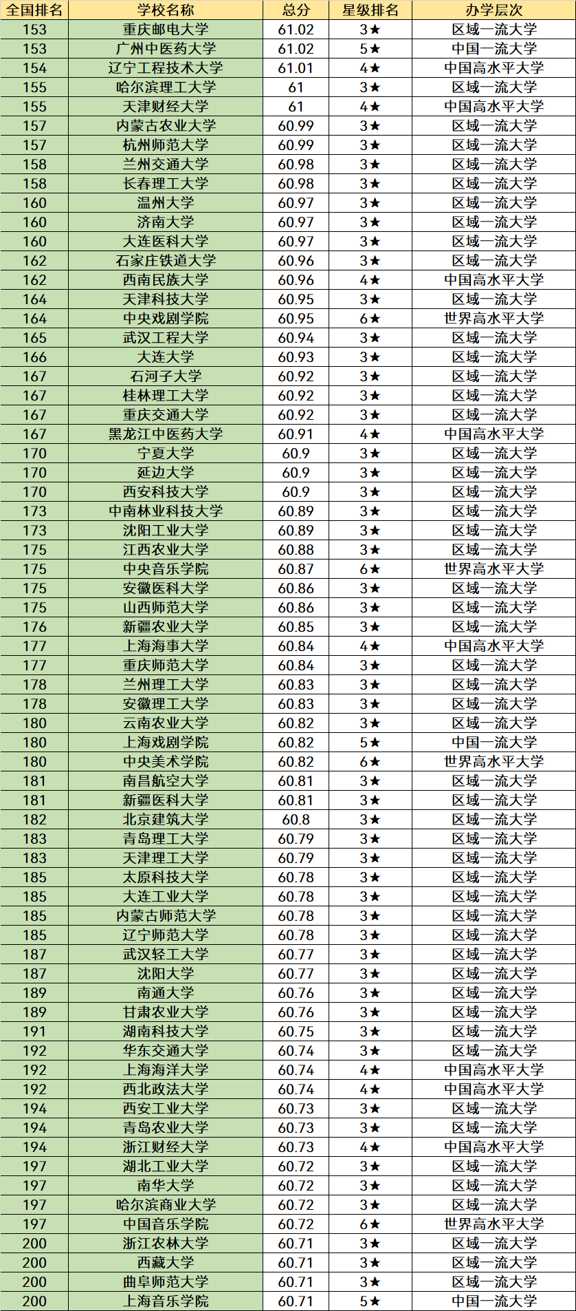 上图整理于校友会中国大学排名,名单是校友会大学排名前200强,具体院校、星级排名和办学层次分布情况。