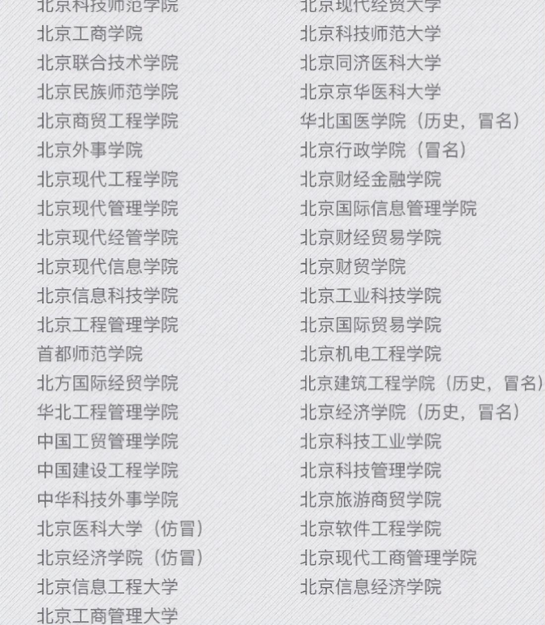 其中像中国邮电大学、中国师范大学、中国经济贸易大学、中国国际工商管理学院、中国传媒艺术学院、首都医学院,名头都带了“中国”或者“首都”,乍一看可像正规大学,还是名气不俗的那种。