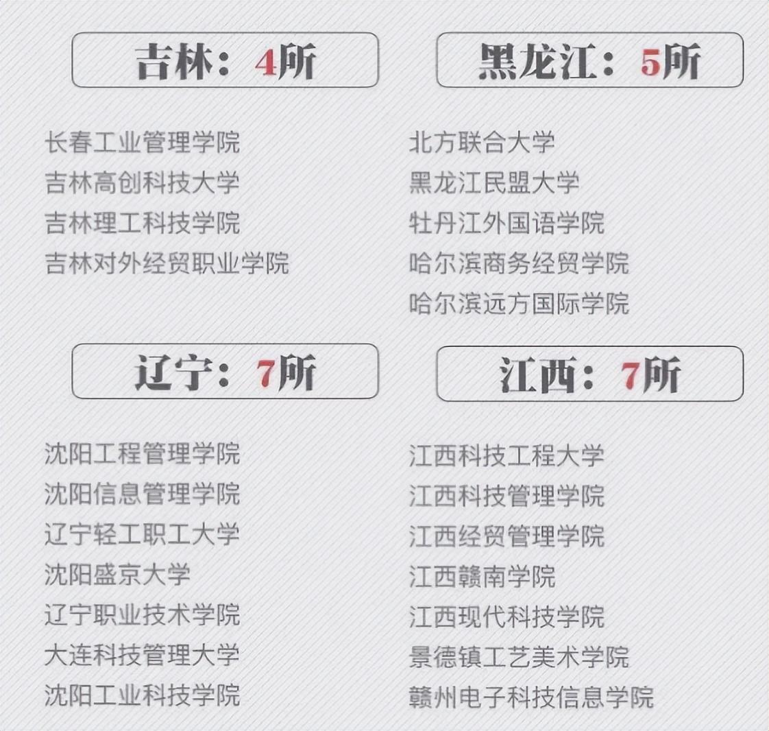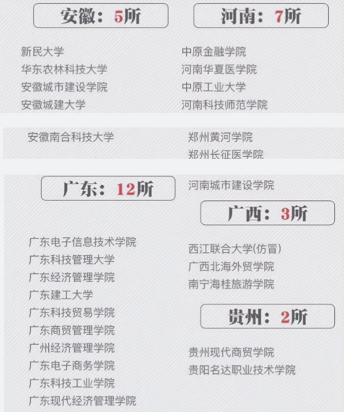 广东的野鸡大学比起前两个省市,还算比较收敛,只有12所,一眼望去依旧是以科技、商贸、管理类方向居多。另外,山东、河北、陕西等省份的野鸡大学也不少,家长们要注意先将这些大学划掉。