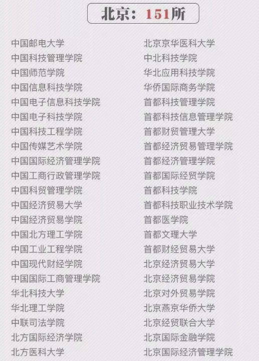 要说学生们最爱扎堆报考的省市,肯定是北上广,那就先从北京开始。一看列表好家伙,竟然有且有151所野鸡大学,占了总数的一小半。只能说野鸡校方真的抓住了家长们的心理,地红是非多啊。