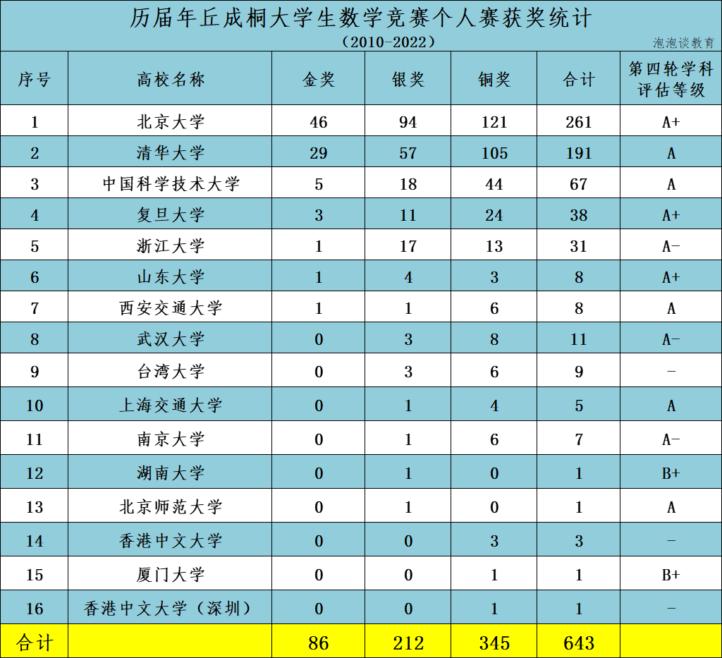 那么在历届的丘成桐大学生数学竞赛个人赛各高校的获奖情况如何,是否与学科评估相匹配呢?我们一起来看一下: