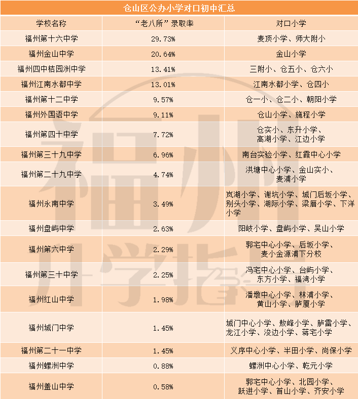 下面是优优老师整理出来的仓山区公办小学对口初中及这些初中的升学率的一个汇总: