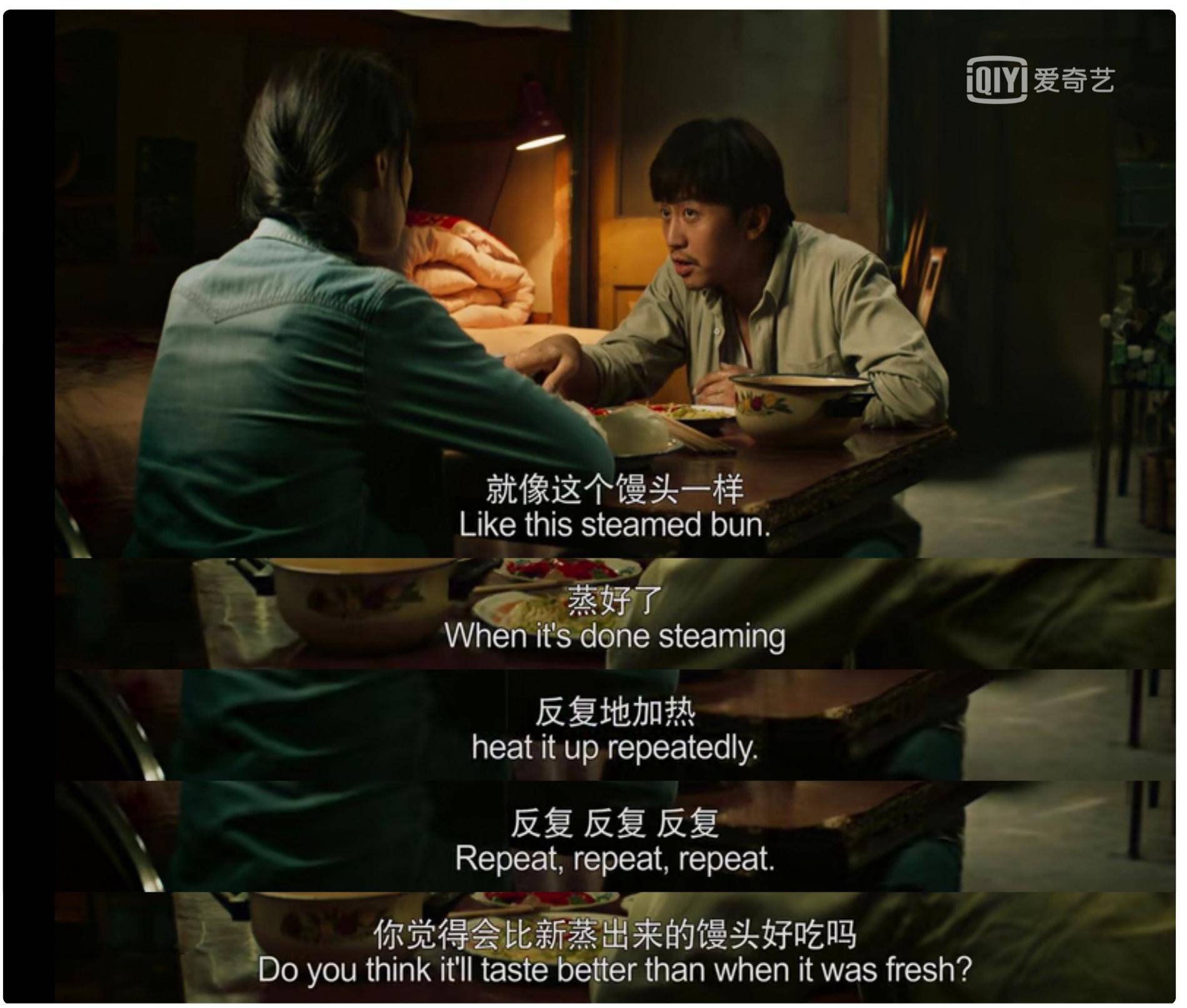 电影里,当马飞的老师质疑马浩文教育方法的时候,马浩文回答说:“就像这个馒头一样,蒸好了,反复加热,反复,反复,反复,你觉得会比新蒸出来的馒头好吃吗?”