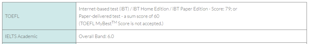托福TOEFL 机考79雅思IELTS 总分6.0及以上;*接受TOEFL iBT Home(托福家庭版)