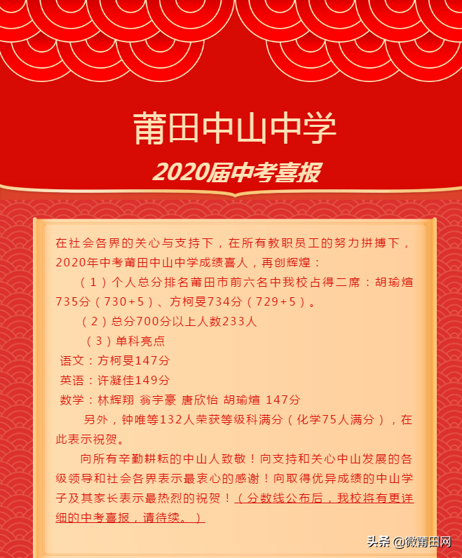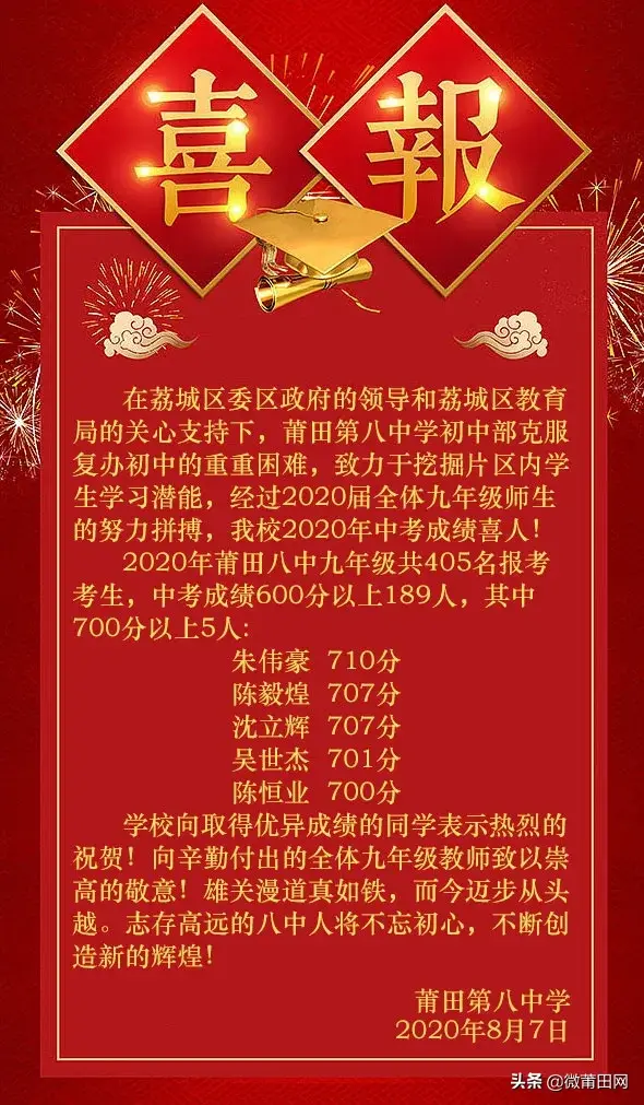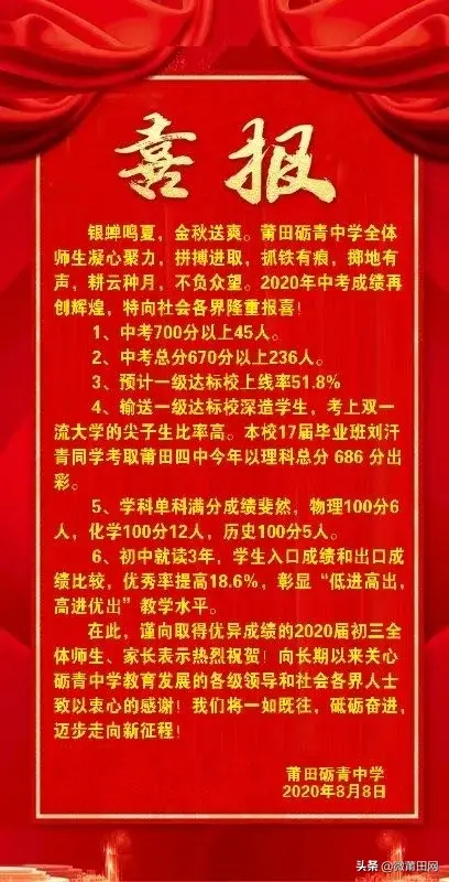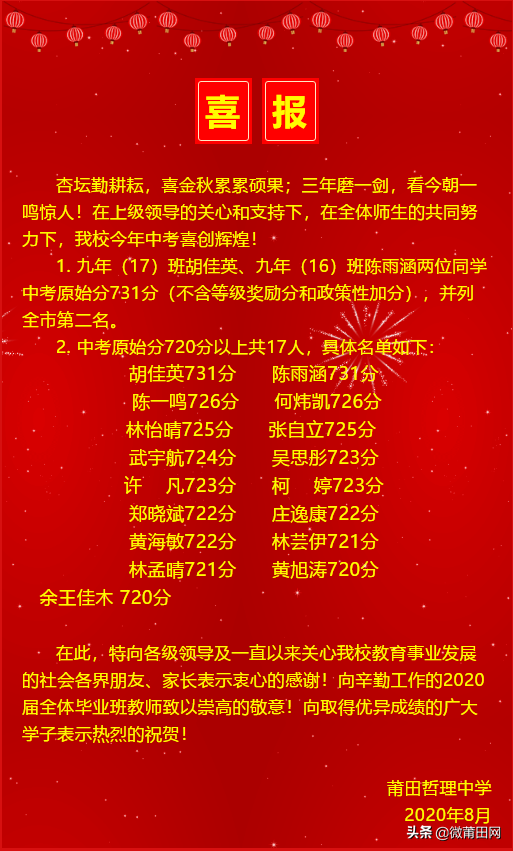 莆田中考成绩已经揭晓了,那么莆田中学这些中考情况如何,莆田擢英中学,中山中学,莆田哲理中学,莆田第八中学,中考喜报来了