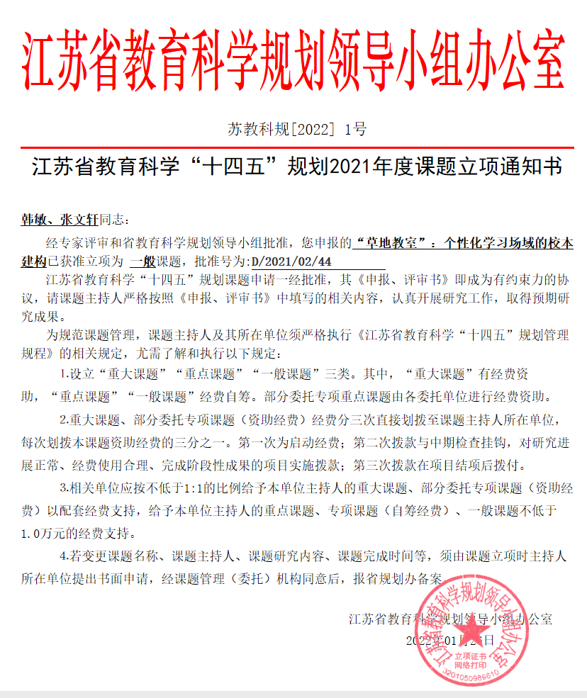 一系列的与琅小交流活动的深入开展,全面提升了学校的办学品质。基于学校“草地教室”的建设,积极探索学教方式的变革,取得初步成果:《草地教室:个性化学习场域的校本建构》被立项为江苏省“十四五”规划课题。《小主人个性化学习项目校本创新与实践研究》被立项为南京市优秀教学成果推广应用研究专项课题。