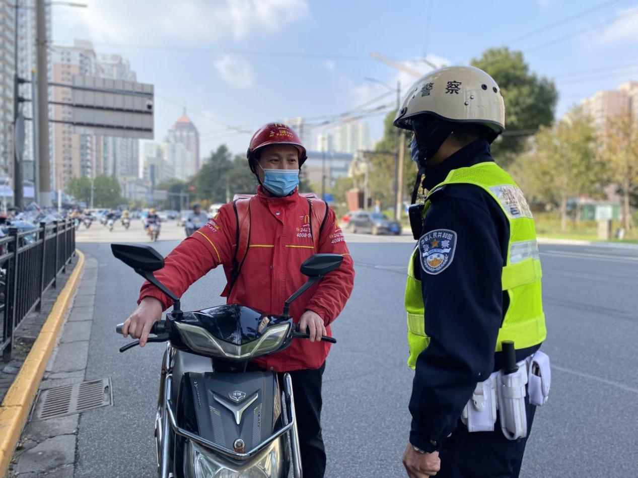 上海交警对一名骑手开展交通安全教育。巨云鹏摄