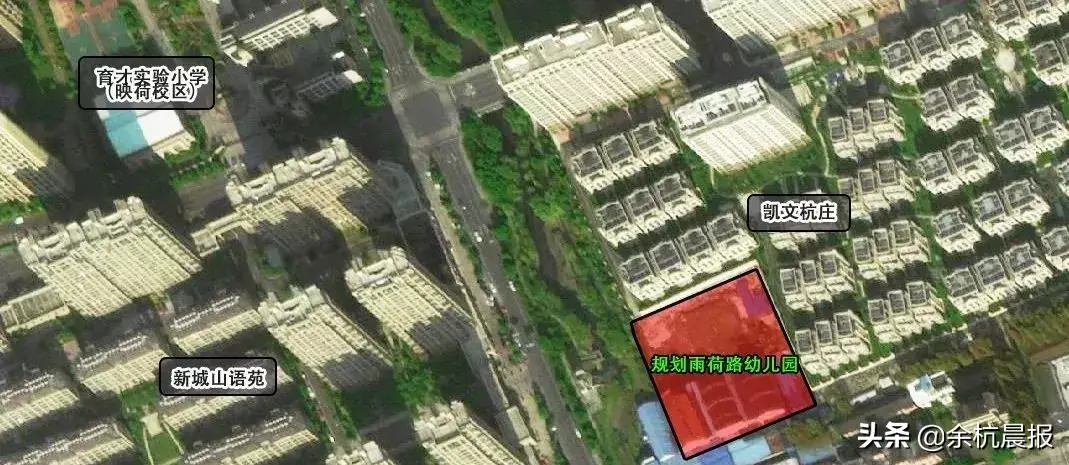 其中,雨荷路幼儿园项目位于雨荷路近星光街东北处,东北两侧紧挨凯文杭庄小区,南至沿山港河道绿地,西至金家角河绿地。选址面积约5628㎡,拟建设12班幼儿园。