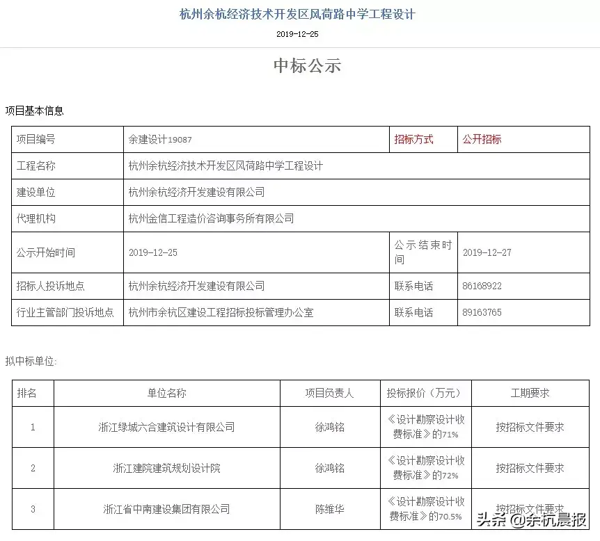 此外,同样位于余杭开发区的风荷路初中项目今日也进行了设计招标结果公示。拟中标排名第一的为:浙江绿城六合建筑设计有限公司。