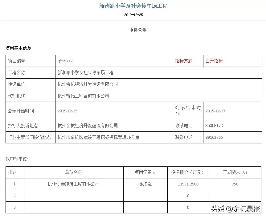 新洲路小学及社会停车场项目施工招标结果今日公示。项目施工拟中标单位为杭州创泰建筑工程有限公司,总工期750天。