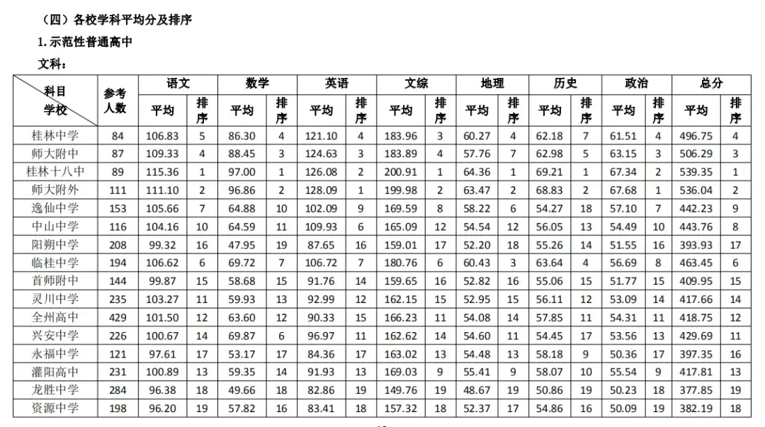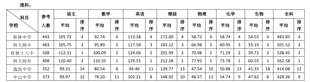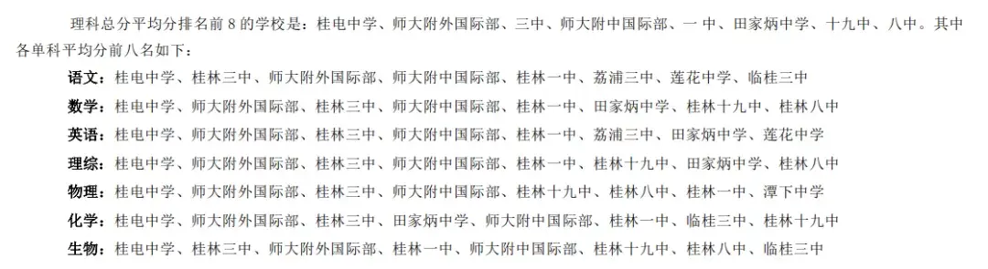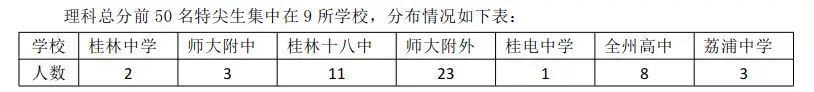 理科:二本上线 2276 人,上线率 35.48%。上线率前八位依次为:桂电中学 99.37%、师大附外国际部 97.65%、桂林三中 94.81%、师大附