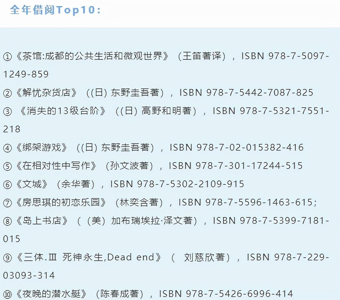 在数以万计的书籍中,总有一些无声的伴侣被同学们偏爱。2021年,《茶馆:成都的公共生活和微观世界》《解忧杂货店》《消失的13级台阶》等中外经典纷纷上榜全年借阅TOP10。