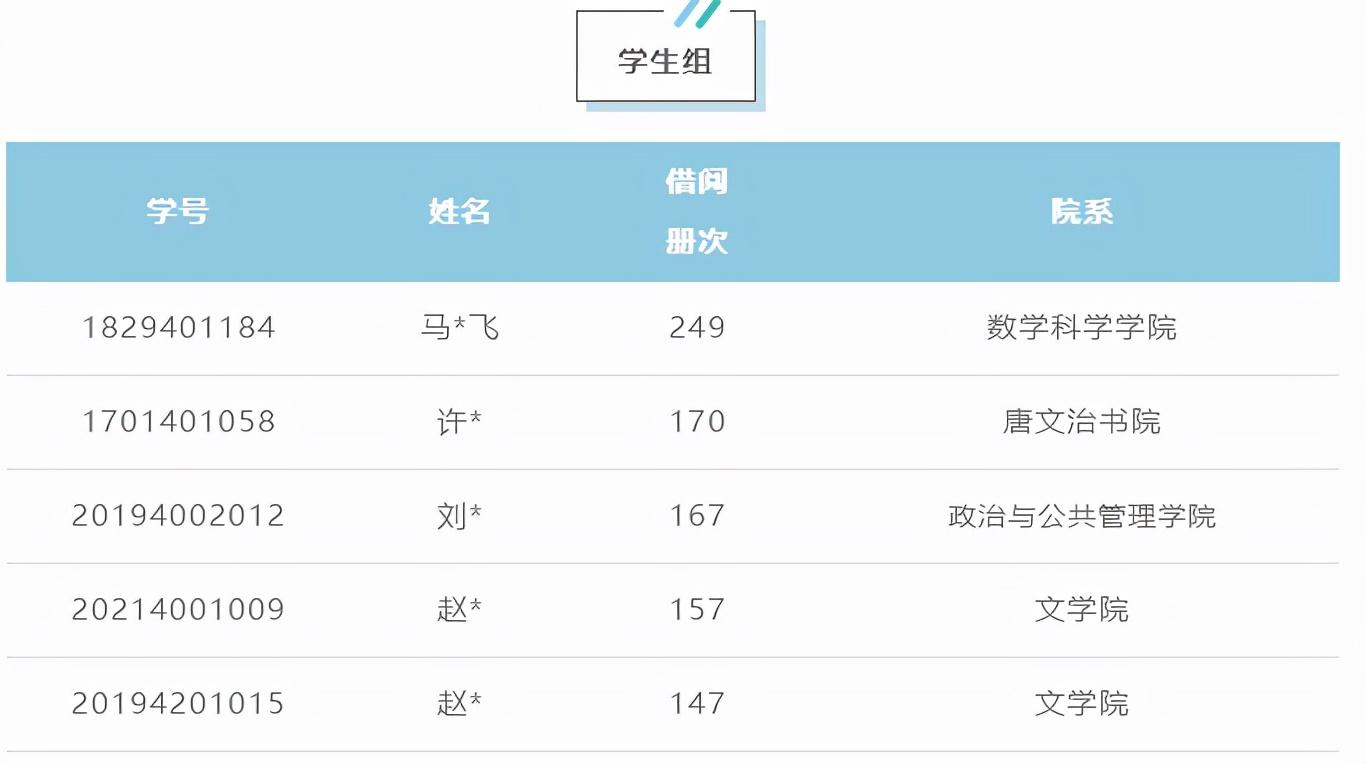放眼学校,每个院系都在知识的海洋中尽情遨游。在“院部借书量TOP5”排行榜中,文学院、王健法学院、艺术学院、政治与公共管理学院、社会学院纷纷上榜。
