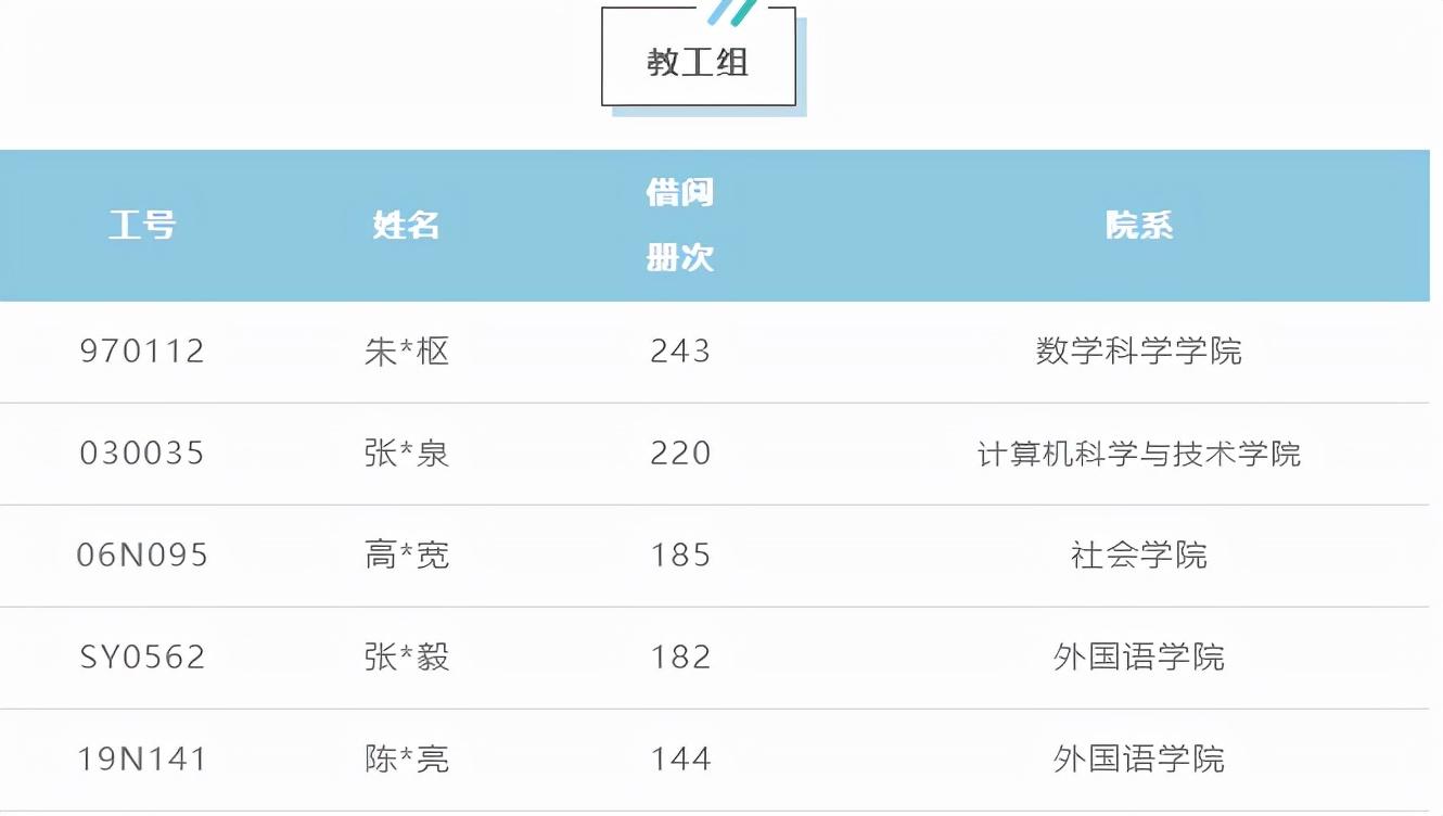 来自政治与公共管理学院的汪同学成为了去年的“年度泡馆达人”,来自数学科学学院的马同学则高居阅读榜榜首,借阅册次249本。而同样来自数学科学学院的朱老师也不遑多让,以243本的借阅册次拿下了教工组的阅读达人TOP1。