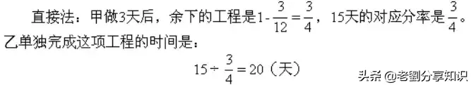 以直接法解题的思维过程是快速缩小问题所涉及的范围,接触事物的本质,打开解题的突破口。有些用一般方法解答要用四五步,甚至更多步计算才能求出结果的应用题,用直接法解答时,只用一两步计算就可以求出结果。