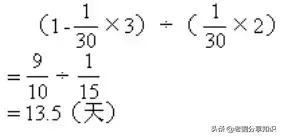 因为做了3天后,剩下的工作量用原来的工作效率去做,还需30-3=27(天),现在工作效率提高到原来的2倍,时间就比原来少一半,所以,还需要的天数是: