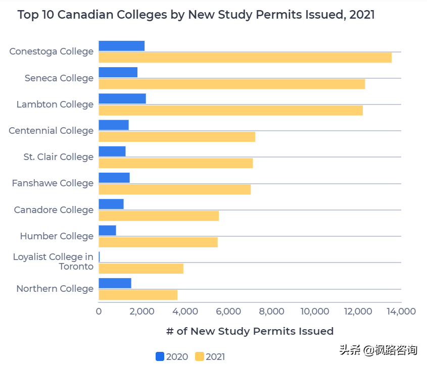 在前十名中,还有一所学院值得特别一提,就是多伦多的洛亚里斯特学院。2021年,发放给多伦多洛亚里斯特学院留学生的学签数量为3,914,而2020年仅有42份,增长超过125倍。