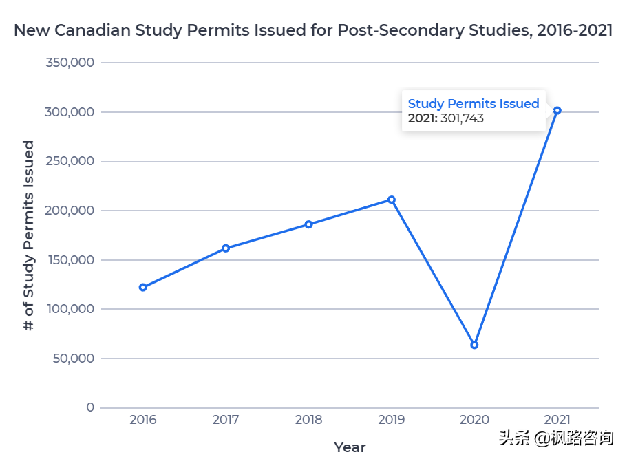 2021年,发放的新学签数量达到新高,超过30万份。这意味着,2021年有近375%的增长,显示出在2020年数量下降后的强劲复苏势态。