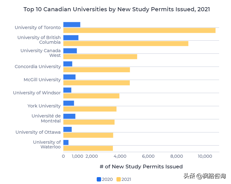 UBC在2021年开始强势回归,升至加拿大第二大最受留学生欢迎的大学。与2020年相比,2021年向UBC留学生发放的新学签增加了730%,相当于多了7,760名留学生。