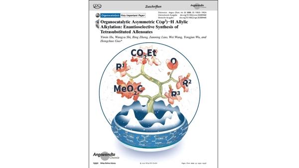 学校理学院郭红超教授课题组在不饱和碳不对称烯丙基化反应研究中取得重要进展,首次实现了联烯碳的不对称烯丙基化反应,为构建具有良好立体选择性的兼具轴手性和中心手性元素的四取代联烯化合物提供了简洁、高效的合成方法,相应研究成果发表在《德国应用化学》上,并被选为VIP(Very Important Paper)和扉页文章。