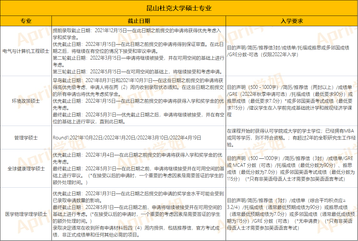 因为定位为文理学院,所以昆山杜克规模不大,硕士招生也仅有5个,在申请要求上不同专业会有所出入,其中医学物理学硕士要求最多,各项成绩要求也最高,而管理学硕士也比较特殊,申请时需要2年以上的工作经验。