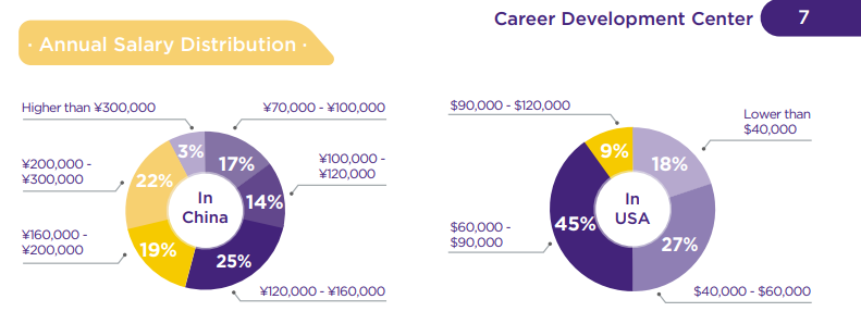 从学校官网公布的最新就业质量报告来看,本科生毕业后任职于世界各国,其中中国大陆占比50%,美国占比30%。而从平均年薪来看,美国的整体薪资水平高于大陆,9-12万美元的占比9%,而大陆平均年薪超过30万人民币的仅占比3%。